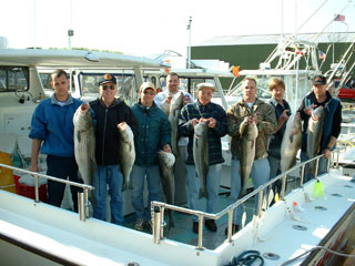 And here we have Fred Gers and crew with a fine limit catch of large rockfish to nearly 40 inches. From left to right, that's Hazen, Fred, Captain Drew, Rick, Art, Larry, and Derrick. |