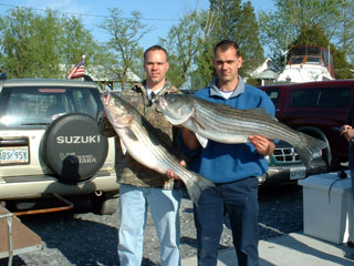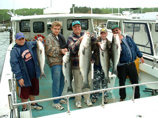 Here's the Ed Pietruszka (far right) crew from April 21, holding a fine limit catch of stripers to 45 inches. From left to right, that's Greg, Brian, Larry, Jeff, and Ed. |