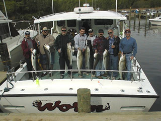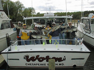Louie "Big Fish" Hugg was back again for another Bay outing on April 26, when he and his crew caught their limit of rockfish to 40 inches. From left to right, that's Louie, John, Jeff, Joe, Bob, Rob, Wayne, and Mike. |