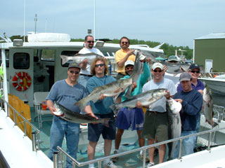 Although the weather was not fit for Man nor beast on April 28, the Otho Williams crew braved the elements to catch a fine limit of stripers to 40 inches. From left to right, that's Chris, Pete, Frank, Otho, Brandon, Frankie, Kathy, and PJ. |