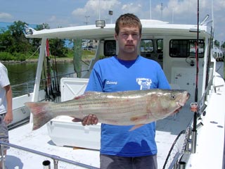 Here we have the Keith Sumner (kneeling) crew from July 15, shown with some of their fine catch of stripers to 36.5 inches. |