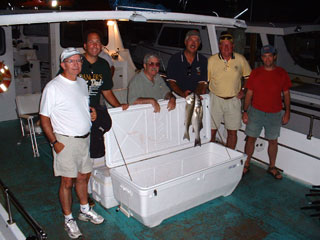 And here we have the Adel Faramawi (far right) crew of September 8, who caught a fine mess of bluefish until the sun hit the trees. |